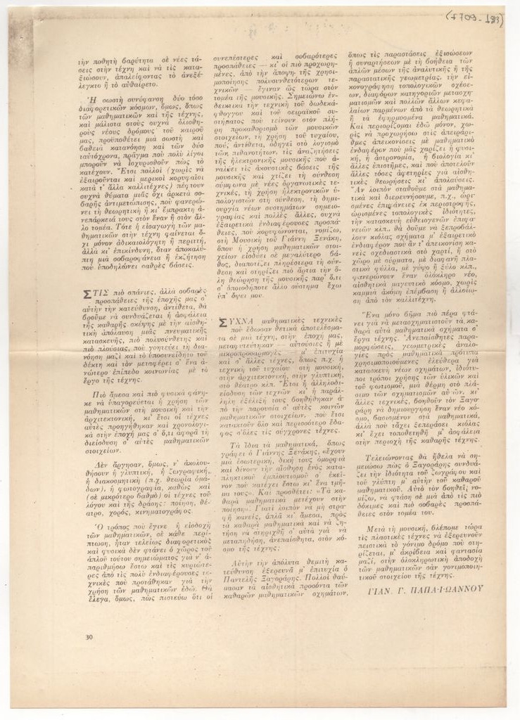 Φωτοαντίγραφο αποκόμματος, έντυπο, χαρτί, 29,6×21,0 εκ., όπου δημοσιεύεται, στα ελληνικά άρθρο του Γιάννη Γ. Παπαΐωάννου για το έργο του Π. Ξαγοράρη. Επάνω, επιγραφή με τα στοιχεία της δημοσίευσης.