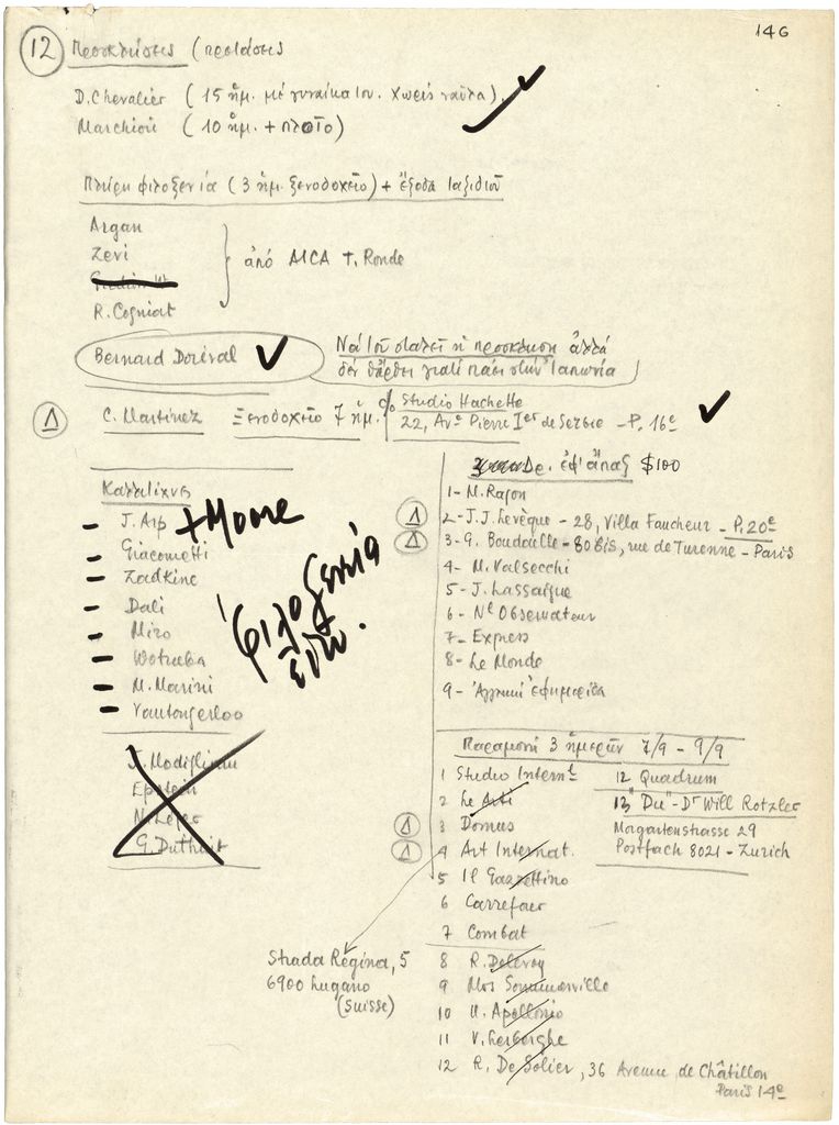 Χειρόγραφο κείμενο (προσχέδιο), χαρτί, 29×21 εκ., στα ελληνικά, του Τώνη Σπητέρη, αναφορικά με τη διοργάνωση της Μπιεννάλε Γλυπτικής (Παναθήναια της Παγκόσμιας Γλυπτικής) στην Αθήνα, τον Σεπτέμβριο 1965.