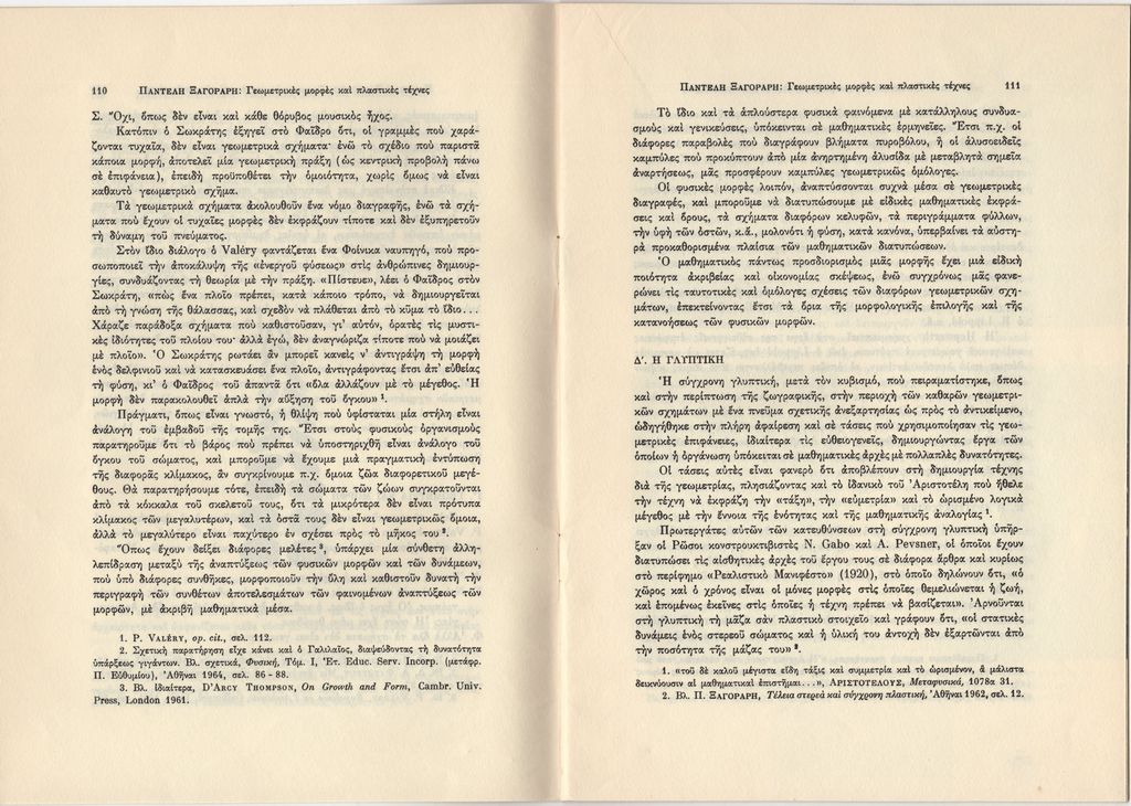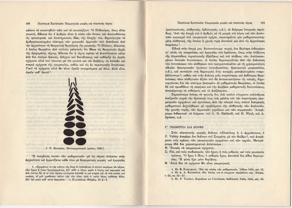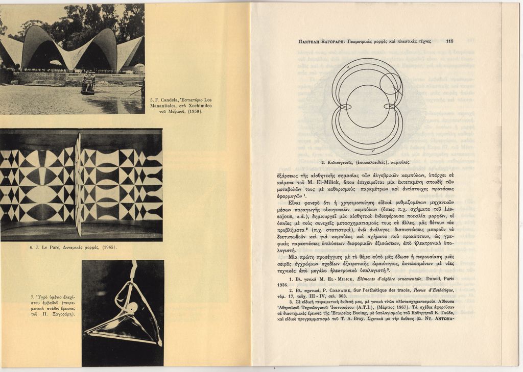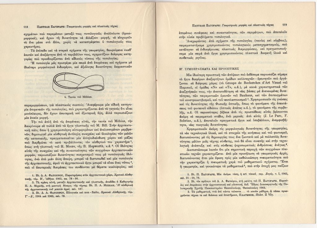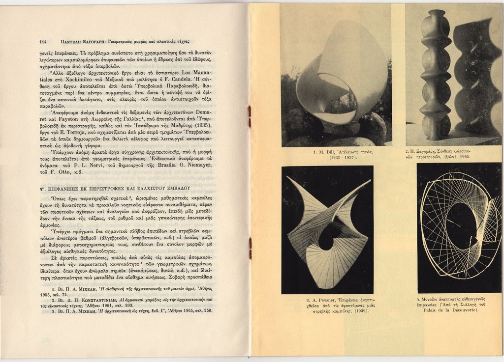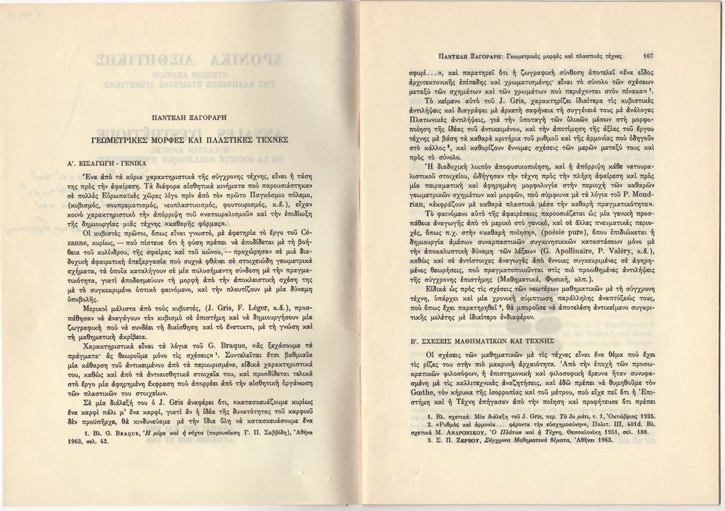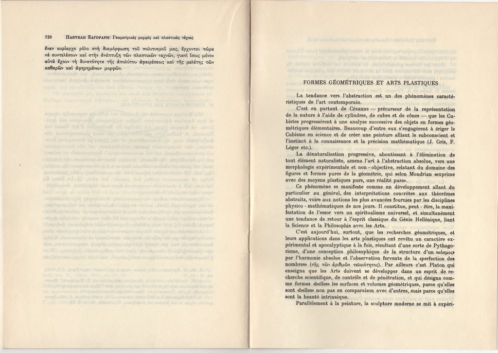 Ανάτυπο, έντυπο, στα ελληνικά με γαλλική περίληψη, χαρτί, 24,1×17,2 εκ. όπου δημοσιεύεται, άρθρο του Παντελή Ξαγοράρη με τίτλο “Γεωμετρικές μορφές και πλαστικές τέχνες”. Στο εξώφυλλο, αφιέρωση στο ζεύγος Σπητέρη. Εικονογραφείται με αναπαραγωγές έργων.