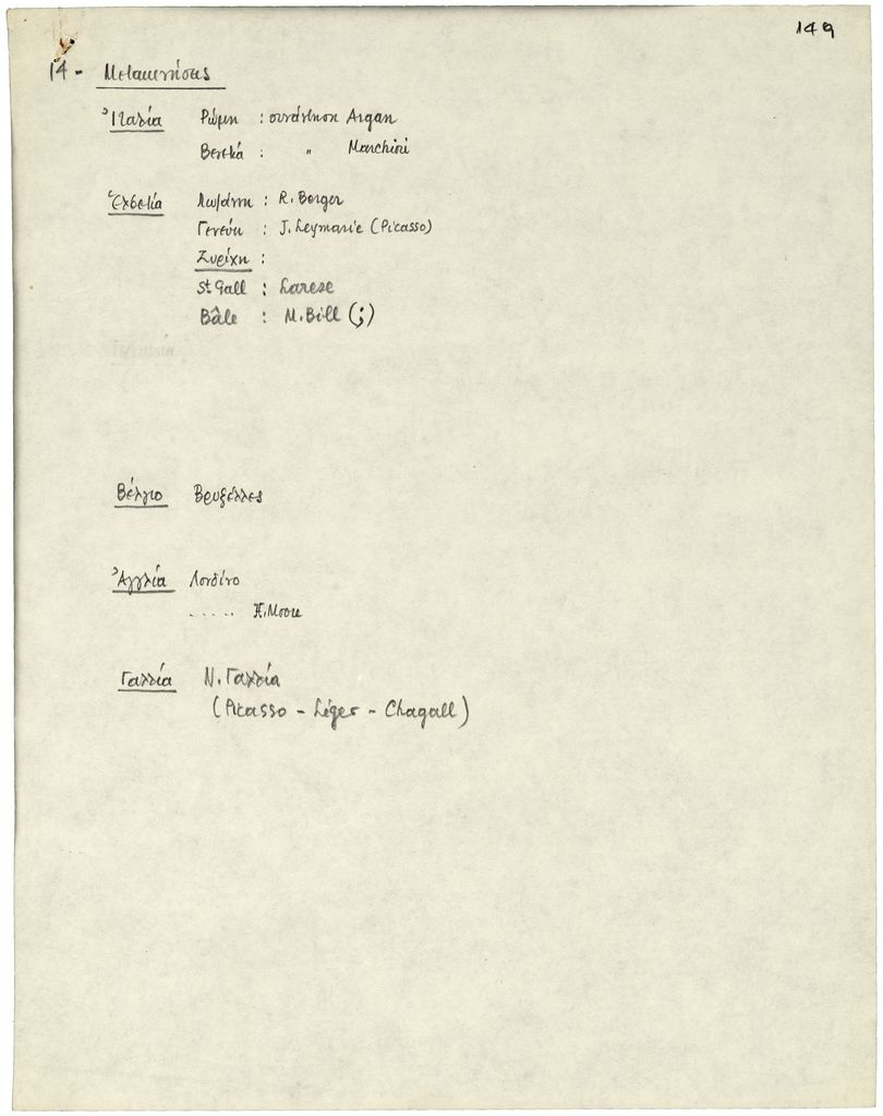 Χειρόγραφο κείμενο, χαρτί, 2 φφ, 27×21 εκ., στα ελληνικά, του Τώνη Σπητέρη, αναφορικά με τη διοργάνωση της Μπιεννάλε Γλυπτικής (Παναθήναια) στην Αθήνα τον Σεπτέμβριο 1965.