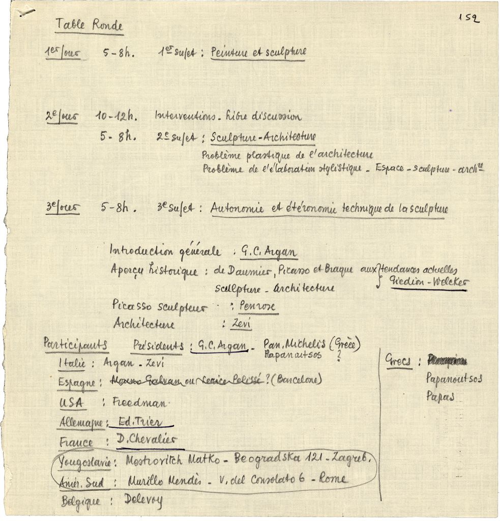 Χειρόγραφες σημειώσεις, χαρτί, 22×21 εκ., στα γαλλικά, του Τώνη Σπητέρη, αναφορικά με τη διοργάνωση της Μπιεννάλε Γλυπτικής (Παναθήναια) στην Αθήνα, τον Σεπτέμβριο 1965.