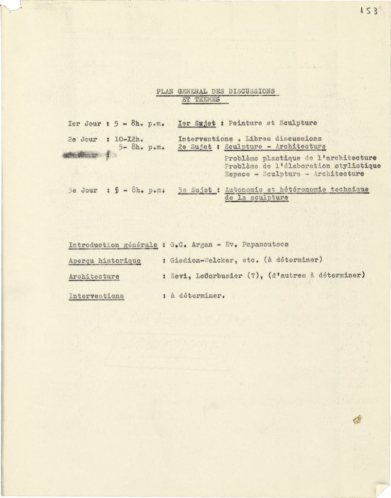 Δακτυλόγραφο κείμενο, χαρτί, 27×21 εκ., στα γαλλικά, του Τώνη Σπητέρη, αναφορικά με τη διοργάνωση της Μπιεννάλε Γλυπτικής (Παναθήναια) στην Αθήνα τον Σεπτέμβριο 1965. Στο παρόν δίνεται το πρόγραμμα της Στρογγυλής Τράπεζας που προγραμματίστηκε.