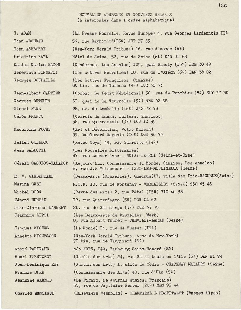Φωτοαντίγραφο δακτυλόγραφου κατάλογου ονομάτων που σχετίζονται με την Μπιεννάλε Γλυπτικής (‘Παναθήναια της Παγκόσμιας Γλυπτικής’), που διοργανώθηκαν στην Αθήνα τον Σεπτέμβριο 1965, χαρτί, 28×21 εκ., στα γαλλικά.