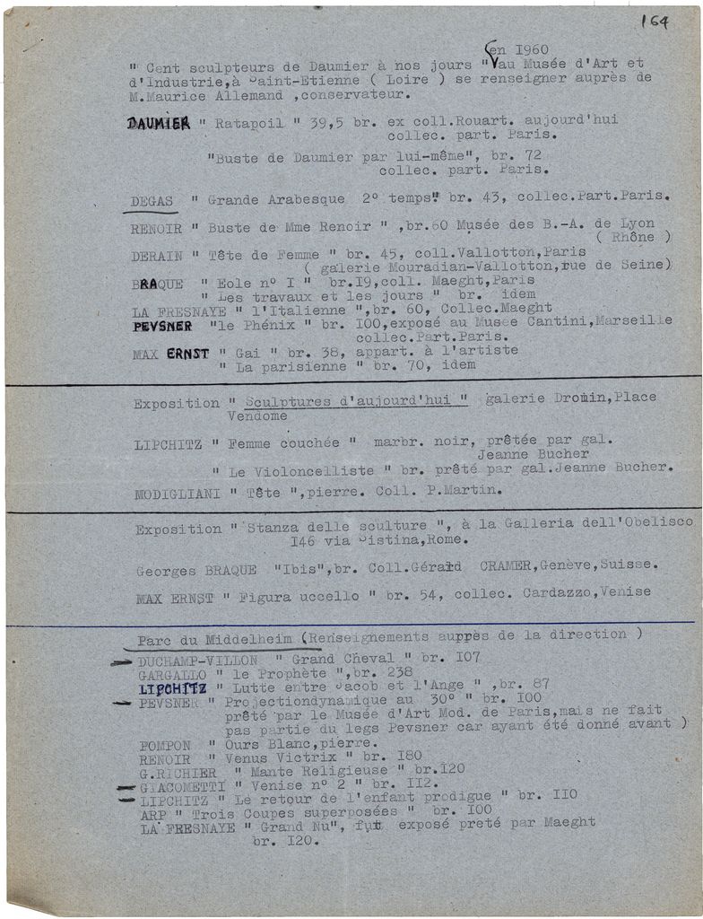 Δακτυλόγραφος κατάλογος ονομάτων καλλιτεχνών, χαρτί, 6 φφ, 28×21 εκ., στα γαλλικά, σε αντιστοιχία με έργα τους, προερχόμενα από εκθέσεις σε διάφορα μουσεία ανά την Ευρώπη. Πιθανόν από αυτόυς προέκυψαν οι συμμετέχοντες στην Μπιεννάλε Γλυπτικής (‘Παναθήναια της Παγκόσμιας Γλυπτικής’) στην Αθήνα το 1965.