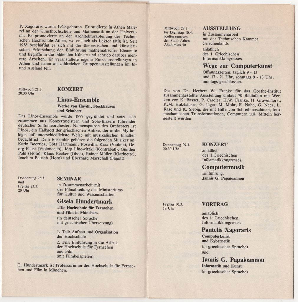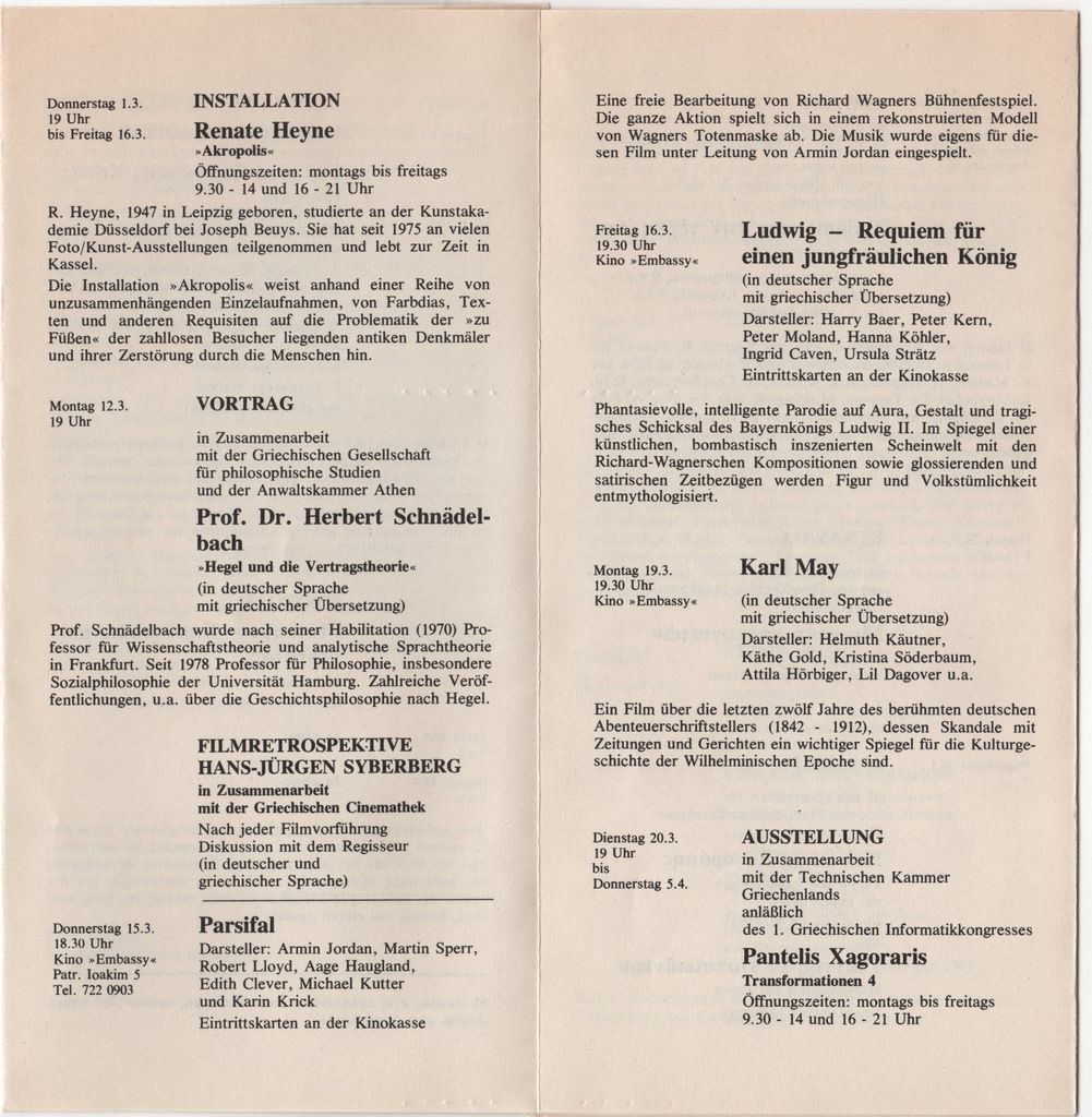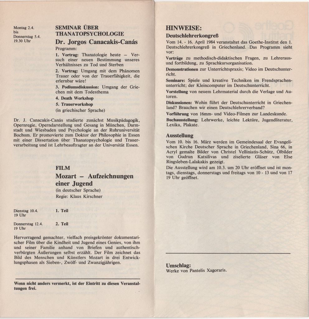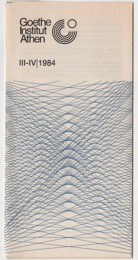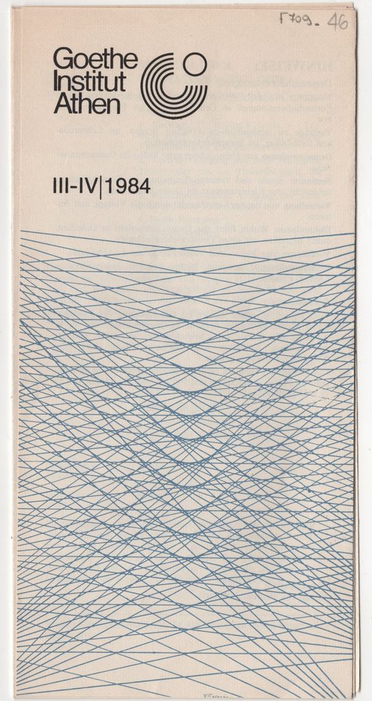 Έντυπο, στα ελληνικά και γερμανικά, πολύπτυχο, χαρτί, 20,3×9,9 εκ. Πρόγραμμα εκδηλώσεων του Ινστιτούτου Goethe Αθηνών κατά την περίοδο 03-04/1984. Περιλαμβάνεται και η ατομική έκθεση του καλλιτέχνη «Μετασχηματισμοί 4» το 1984.