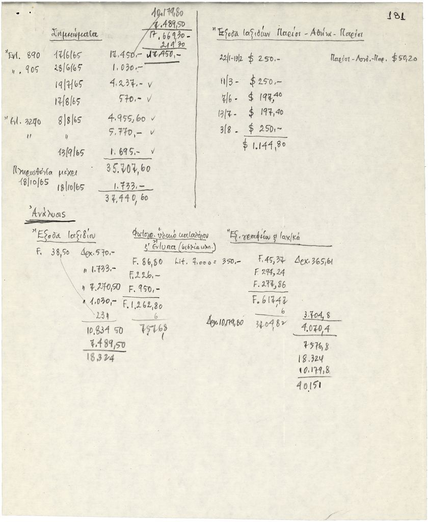 Αναγράφονται διάφορα έξοδα για τις ανάγκες της Μπιεννάλε Γλυπτικής-‘Παναθήναια της Παγκόσμιας Γλυπτικής’ στην Αθήνα τον Σεπτέμβριο 1965.
