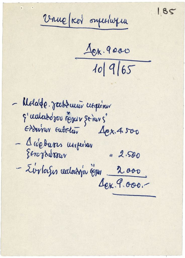 Υπηρεσιακό σημείωμα του Τώνη Σπητέρη, χειρόγραφο, χαρτί, 14×10 εκ., στα ελληνικά. Αναγράφονται έξοδα για τον κατάλογο της Μπιεννάλε Γλυπτικής-‘Παναθήναια της Παγκόσμιας Γλυπτικής’ της Αθήνας τον Σεπτέμβριο 1965.