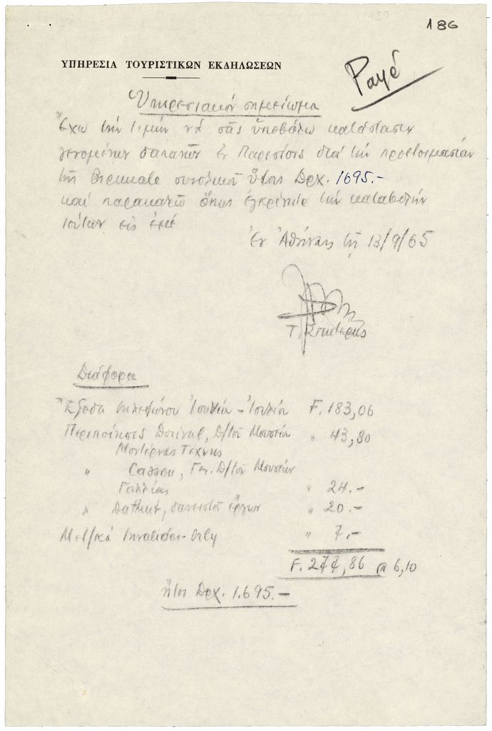 Αναγράφονται έξοδα που έγιναν για τις ανάγκες διοργάνωσης της Μπιεννάλε Γλυπτικής-‘Παναθήναια της Παγκόσμιας Γλυπτικής’, στην Αθήνα, τον Σεπτέμβριο 1965.