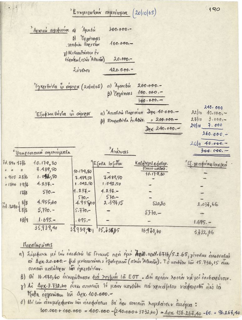 Αντίγραφο ενημερωτικού σημειώματος του Τώνη Σπητέρη, χειρόγραφο, χαρτί, 28×21 εκ., στα ελληνικά. Αναγράφονται έξοδα που έγιναν για τις ανάγκες διοργάνωσης της Μπιεννάλε Γλυπτικής-‘Παναθήναια της Παγκόσμιας Γλυπτικής’ στην Αθήνα τον Σεπτέμβριο 1965.
