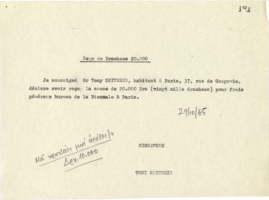 Επιβεβαίωση πληρωμής του Τώνη Σπητέρη, δακτυλόγραφη, χαρτί, 15,5×21 εκ., στα γαλλικά, για τις ανάγκες διοργάνωσης της Μπιεννάλε Γλυπτικής-‘Παναθήναια της Παγκόσμιας Γλυπτικής’ στην Αθήνα, τον Σεπτέμβριο 1965.