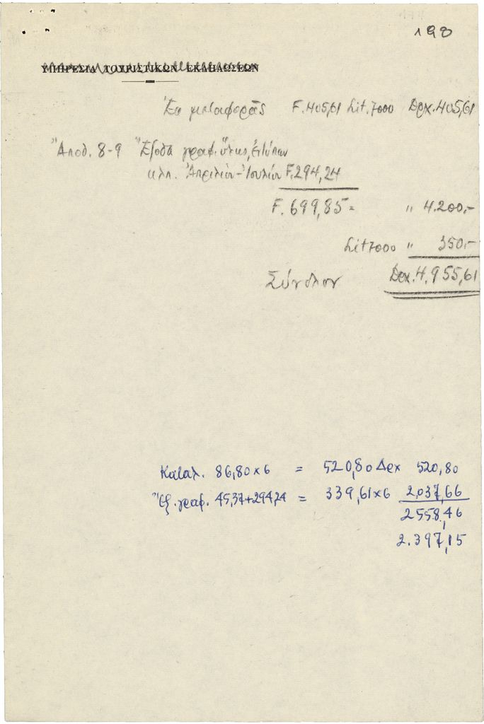 Αντίγραφο υπηρεσιακού σημειώματος του Τώνη Σπητέρη, χειρόγραφο, χαρτί, 21×14 εκ., στα ελληνικά. Αναγράφονται έξοδα για τις ανάγκες της διοργάνωσης της Μπιεννάλε Γλυπτικής-‘Παναθήναια της Παγκόσμιας Γλυπτικής’ στην Αθήνα.