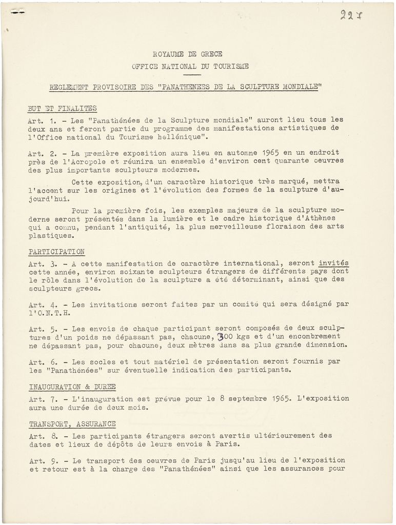 Δακτυλόγραφο κείμενο, χαρτί, 2 φφ, 27×21 εκ., στα γαλλικά. Δίνεται ο προσωρινός κανονισμός των ‘Παναθηναίων της Παγκόσμιας Γλυπτικής’ της Αθήνας.