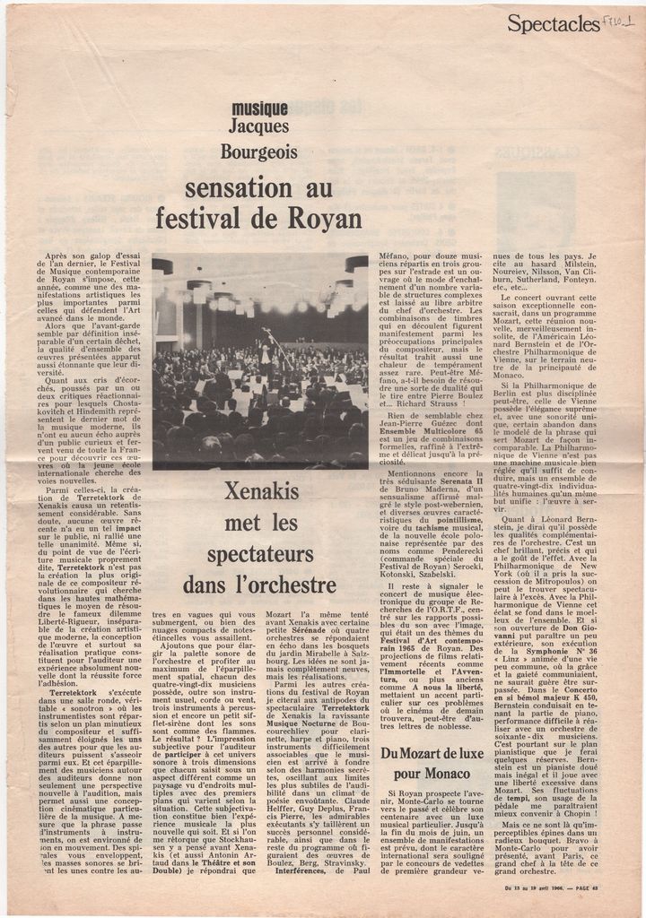 Απόκομμα, έντυπο, χαρτί, 40,2×27,7 εκ., όπου δημοσιεύεται άρθρο του Jacques Bourgeois με θέμα την παρουσίαση του έργου του Ιάννη Ξενάκη “Terretektork”στο Festival de Musique Contemporaine de Royan το 1966. Στο ίδιο άρθρο γίνεται αναφορά και σε συναυλία με έργα W.A. Mozart στο Monte Carlo σε διεύθυνση Leonard Bernstein. Εικονογραφείται με αναπαραγωγή φωτογραφίας από τη συναυλία στο Monte Carlo (;). Στην πίσω όψη, δισκοπαρουσιάσεις και αναγγελία εκθέσεων του V. Guilgot και Mathilde Pfaff..