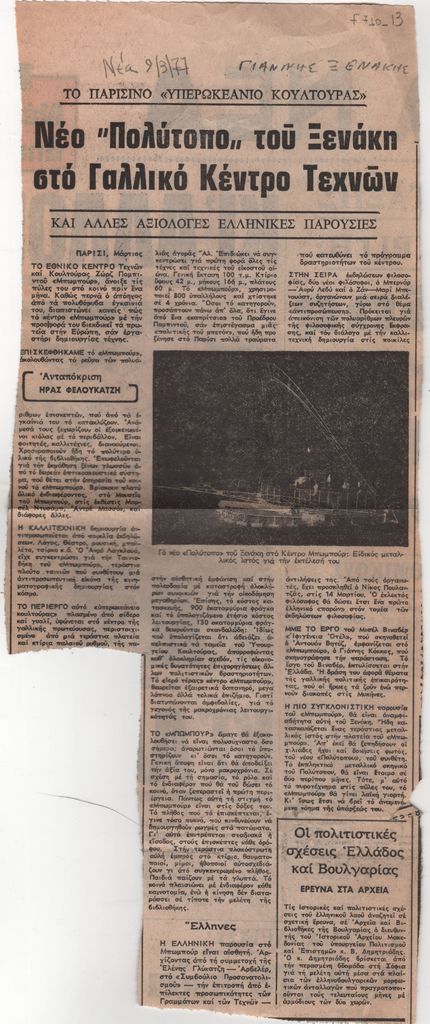 Απόκομμα, έντυπο, χαρτί, 38,5×16,5 εκ., όπου δημοσιεύεται, στα ελληνικά, άρθρο της Η. Φελουκατζή για την εγκατάσταση του νέου “Πολύτοπου” του Ιάννη Ξενάκη στο Εθνικό Κέντρο Τεχνών και Κουλτούρας Ζωρζ Πομπιντού στο Παρίσι το 1977. Επάνω, επιγραφή με τα στοιχεία της δημοσίευσης.