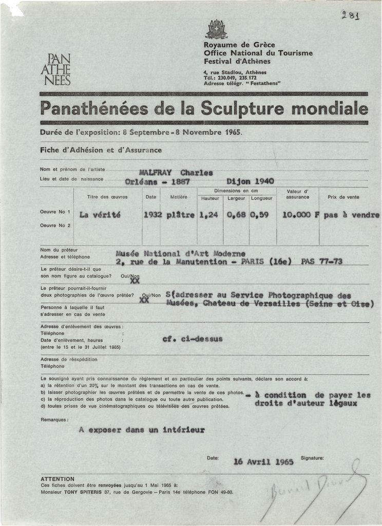 Αντίγραφο δελτίου συμμετοχής και ασφάλισης έργων τα οποία παρουσιάζονται στα ‘Παναθήναια της Παγκόσμιας Γλυπτικής’, στην Αθήνα, χαρτί, 29×21 εκ., στα γαλλικά.