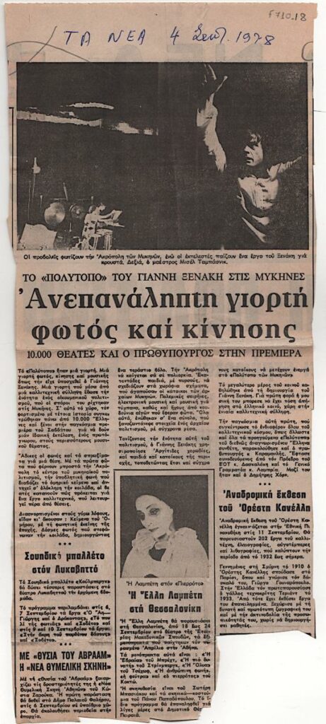 Απόκομμα, έντυπο, χαρτί, 36,0×15,5 εκ., όπου δημοσιεύεται, στα ελληνικά, άρθρο για την παρουσίαση του έργου του Ιάννη Ξενάκη “Πολύτοπο” στις Μυκήνες στις 02-05/09/1978. Στο ίδιο τεκμήριο, πολιτιστική επικαιρότητα και αναγγελία της αναδρομικής έκθεσης των εγκαινίων της αναδρομικής έκθεσης έργων του Ορέστη Κανέλλη. Επάνω, επιγραφή με τα στοιχεία της δημοσίευσης.