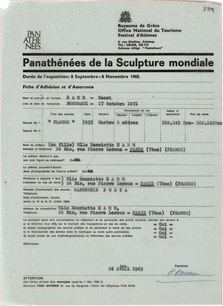 Αντίγραφο δελτίου συμμετοχής και ασφάλισης έργων τα οποία παρουσιάζονται στα ‘Παναθήναια της Παγκόσμιας Γλυπτικής’ στην Αθήνα, χαρτί, 29×21 εκ., στα γαλλικά.
