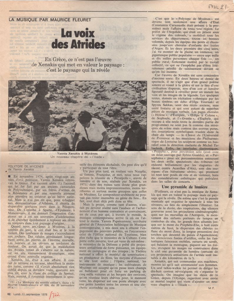 Απόκομμα, έντυπο, χαρτί, 30,5×23,5 εκ., όπου δημοσιεύεται, στα γαλλικά, κριτική του M. Fleuret για την παρουσίαση του έργου του Ιάννη Ξενάκη “Πολύτοπο” στις Μυκήνες τον Σεπτέμβριο του 1978. Κάτω, χειρόγραφη επιγραφή με τα στοιχεία της δημοσίευσης. Στην άλλη όψη, άρθρο του Michel le Bris για τη ραδιοφωνική μετάδοση του έργου “Χειμωνιάτικο ταξίδι” του Franz Schubert. και του έργου “Τραγούδι της Γης” του Gustav Mahler.