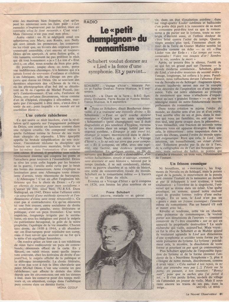 Απόκομμα, έντυπο, χαρτί, 32,5×23,5 εκ., όπου δημοσιεύεται, στα γαλλικά, κριτική του Michel le Bris για τη ραδιοφωνική μετάδοση του έργου “Χειμωνιάτικο Ταξίδι” του Franz Schubert. και του έργου “Τραγούδι της Γης” του Gustav Mahler. Στην άλλη όψη, κριτική του M. Fleuret για την παρουσίαση του έργου του Ιάννη Ξενάκη “Πολύτοπο” στις Μυκήνες τον Σεπτέμβριο του 1978.