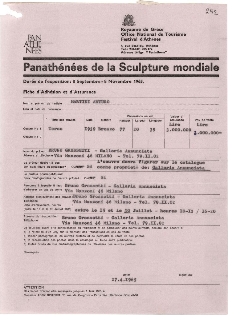 Αντίγραφο δελτίου συμμετοχής και ασφάλισης έργων τα οποία παρουσιάζονται στα ‘Παναθήναια της Παγκόσμιας Γλυπτικής’, στην Αθήνα, χαρτί, 29×21 εκ., στα γαλλικά.