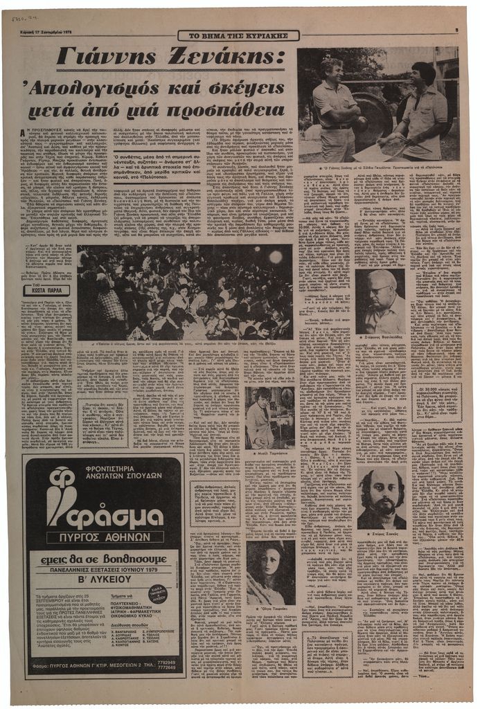 Απόκομμα, έντυπο, χαρτί, 63,0×42,2 εκ., όπου δημοσιεύεται, στα ελληνικά συνέντευξη του Ιάννη Ξενάκη στον Κώστα Πάρλα στον απόηχο της παρουσίασης του έργου “Πολύτοπον” στις Μυκήνες τον Σεπτέβριο του 1978.