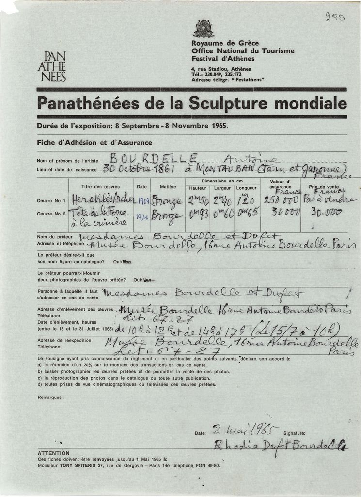 Αντίγραφο δελτίου συμμετοχής και ασφάλισης έργων τα οποία παρουσιάζονται στα ‘Παναθήναια της Παγκόσμιας Γλυπτικής’ στην Αθήνα, χαρτί, 29×21 εκ., στα γαλλικά.