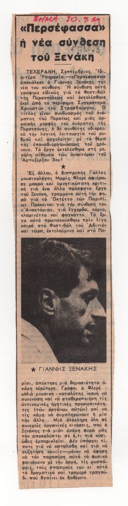Απόκομμα, έντυπο, χαρτί, 24,0×5,0 εκ., όπου δημοσιεύεται, στα ελληνικά, άρθρο για τον συνθέτη Ιάννη Ξενάκη με αφορμή την παρουσίαση του έργου του “Περσέφασσα” στην Τεχεράνη το 1969.
