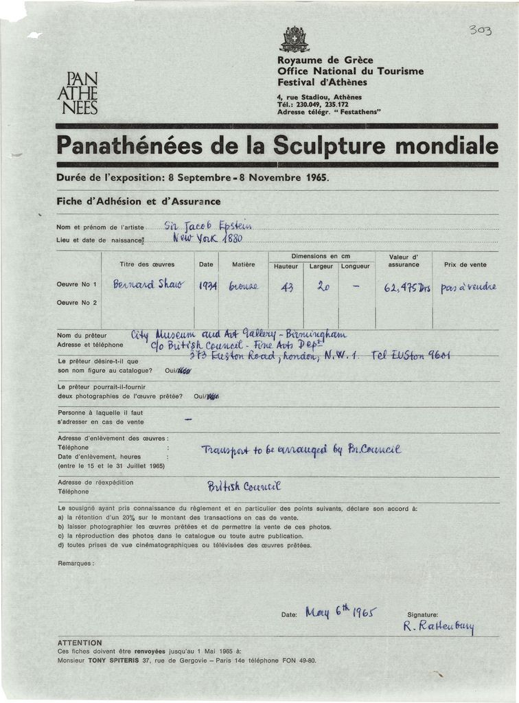 Αντίγραφο δελτίου συμμετοχής και ασφάλισης έργων τα οποία παρουσιάζονται στα ‘Παναθήναια της Παγκόσμιας Γλυπτικής’ στην Αθήνα, χαρτί, 29×21 εκ., στα γαλλικά.