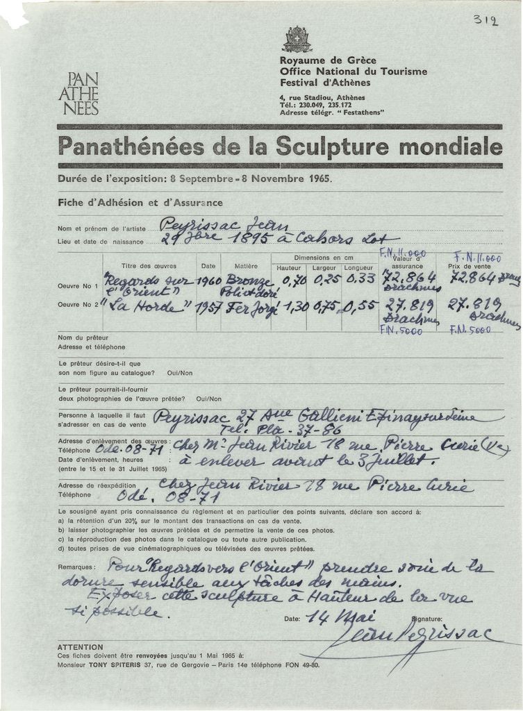 Αντίγραφο δελτίου συμμετοχής και ασφάλισης έργων τα οποία παρουσιάζονται στα ‘Παναθήναια της Παγκόσμιας Γλυπτικής’ στην Αθήνα, χαρτί, 29×21 εκ., στα γαλλικά.