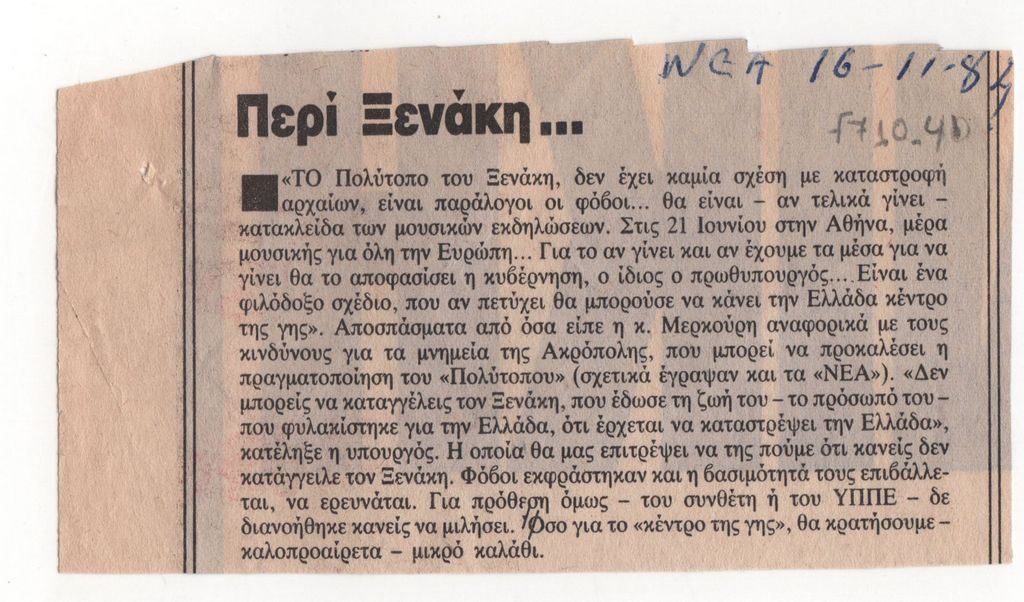 Απόκομμα, έντυπο, χαρτί, 6,3×11,3 εκ., όπου δημοσιεύεται, στα ελληνικά, άρθρο σχετικά με την υποδοχή της πρότασης του Ιάννη Ξενάκη για την δημιουργίας “Πολύτοπου” στην Ακρόπολη της Αθήνας στα πλαίσια των εκδηλώσεων “Αθήνα-Πολιτιστική πρωτεύουσα της Ευρώπης”.