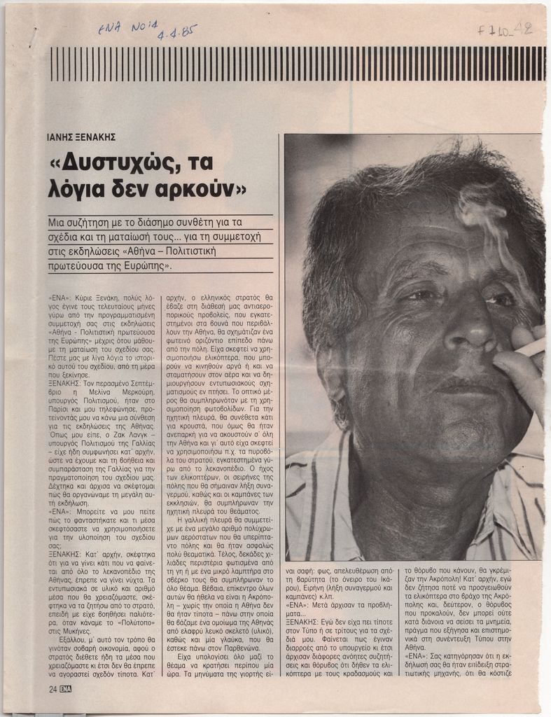 Απόκομμα, έντυπο, χαρτί ιλουστρασιόν, 30,0×21,5 εκ., 2 φφ., όπου δημοσιεύεται, στα ελληνικά, συνέντευξη του Ιάννη Ξενάκη στον Αλέξη Χρυσοστάλη σχετικά με την απόρριψη της πρότασης του καλλιτέχνη για την δημιουργίας “Πολύτοπου” στην Ακρόπολη της Αθήνας στα πλαίσια των εκδηλώσεων “Αθήνα-Πολιτιστική πρωτεύουσα της Ευρώπης”.