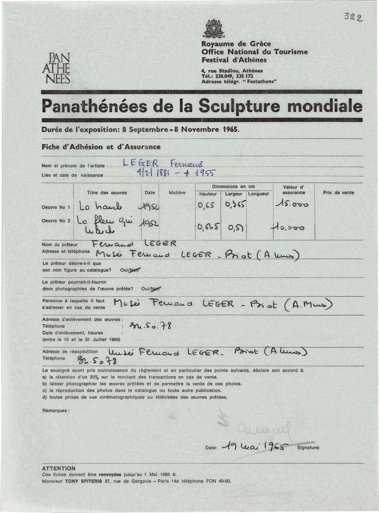 Αντίγραφο δελτίου συμμετοχής και ασφάλισης έργων τα οποία παρουσιάζονται στα ‘Παναθήναια της Παγκόσμιας Γλυπτικής’, στην Αθήνα, χαρτί, 29×21 εκ., στα γαλλικά.