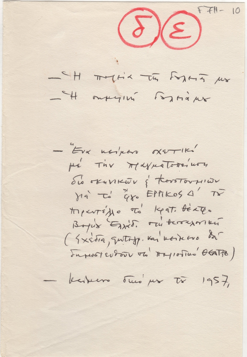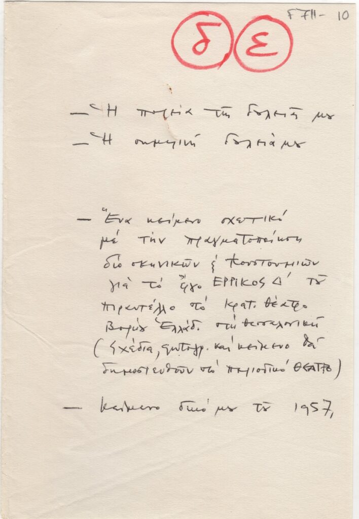 Κείμενο, χειρόγραφο (ιδιόγραφο) με μαύρο μελάνι, χαρτί, 29×21,5 εκ., στα ελληνικά, του Κοσμά Ξενάκη για την καλλιτεχνική του πορεία. Σημειώνεται πως γράφηκε με αφορμή το ανέβασμα θεατρικού έργου “Ερρίκος Δ'” του Πιραντέλλο στο ΚΘΒΕ.