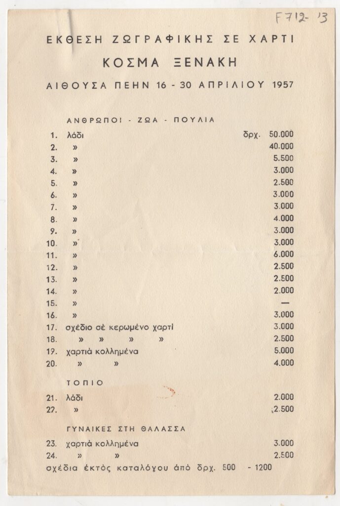 Τιμοκατάλογος, χαρτί, 21,5×14,5 εκ., στα ελληνικά, έργων ατομικής έκθεσης ζωγραφικής του Κοσμά Ξενάκη.