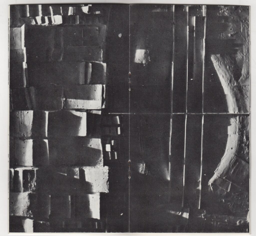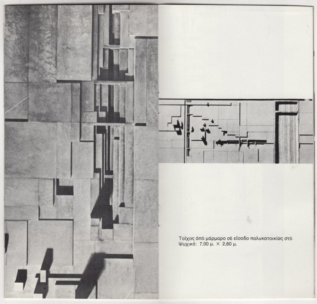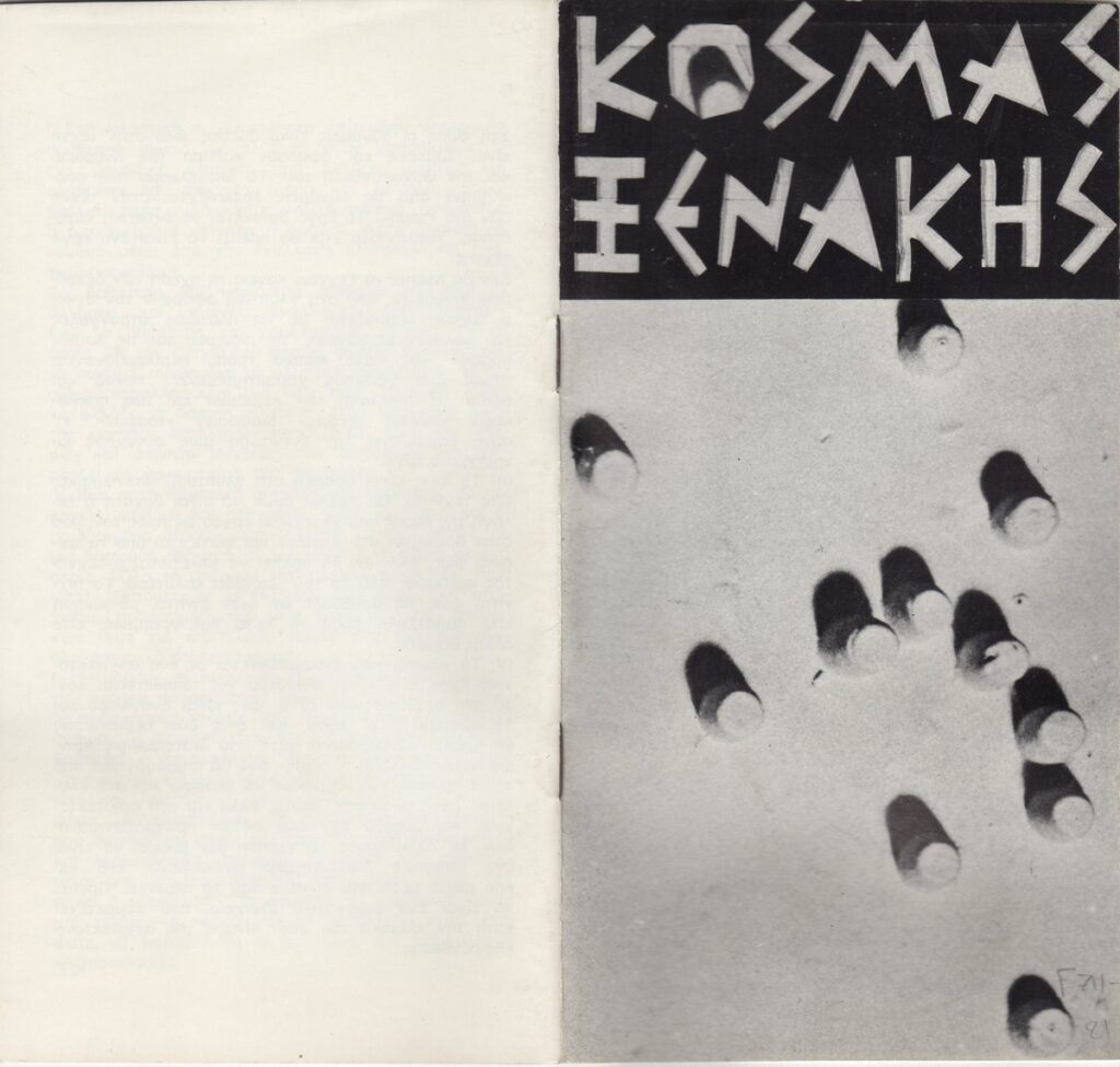 Κατάλογος, χαρτί ιλλουστρασιόν, 14 φφ, 20×10,5 εκ., στα ελληνικά, έκθεσης του Κοσμά Ξενάκη. Περιέχει κείμενο του καλλιτέχνη για το έργο του και εικονογράφηση.