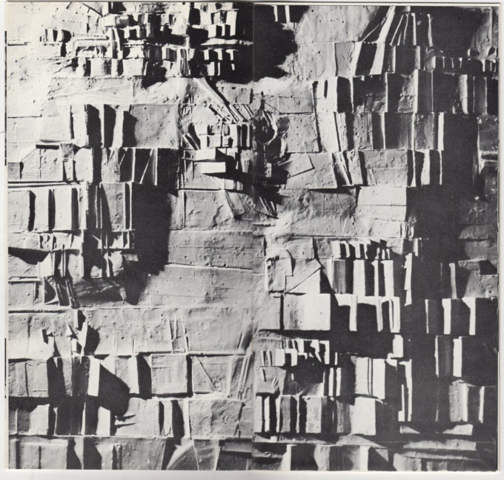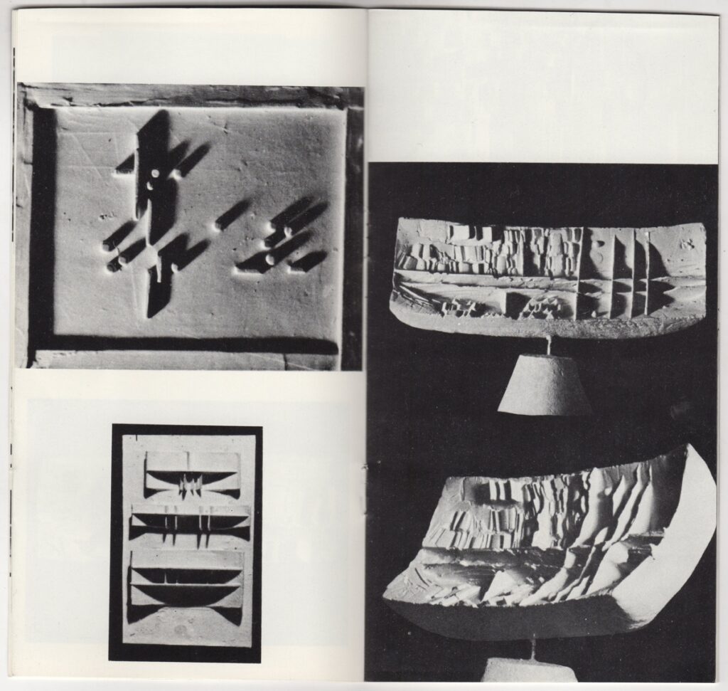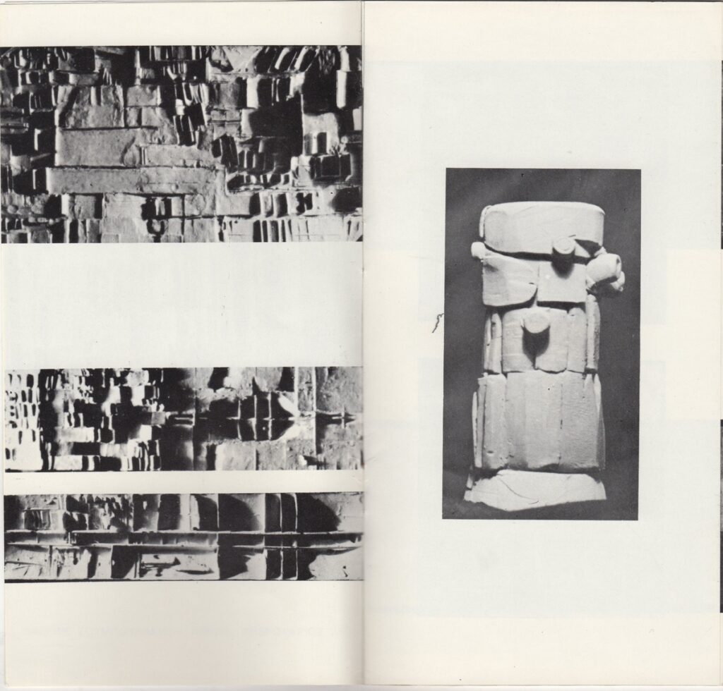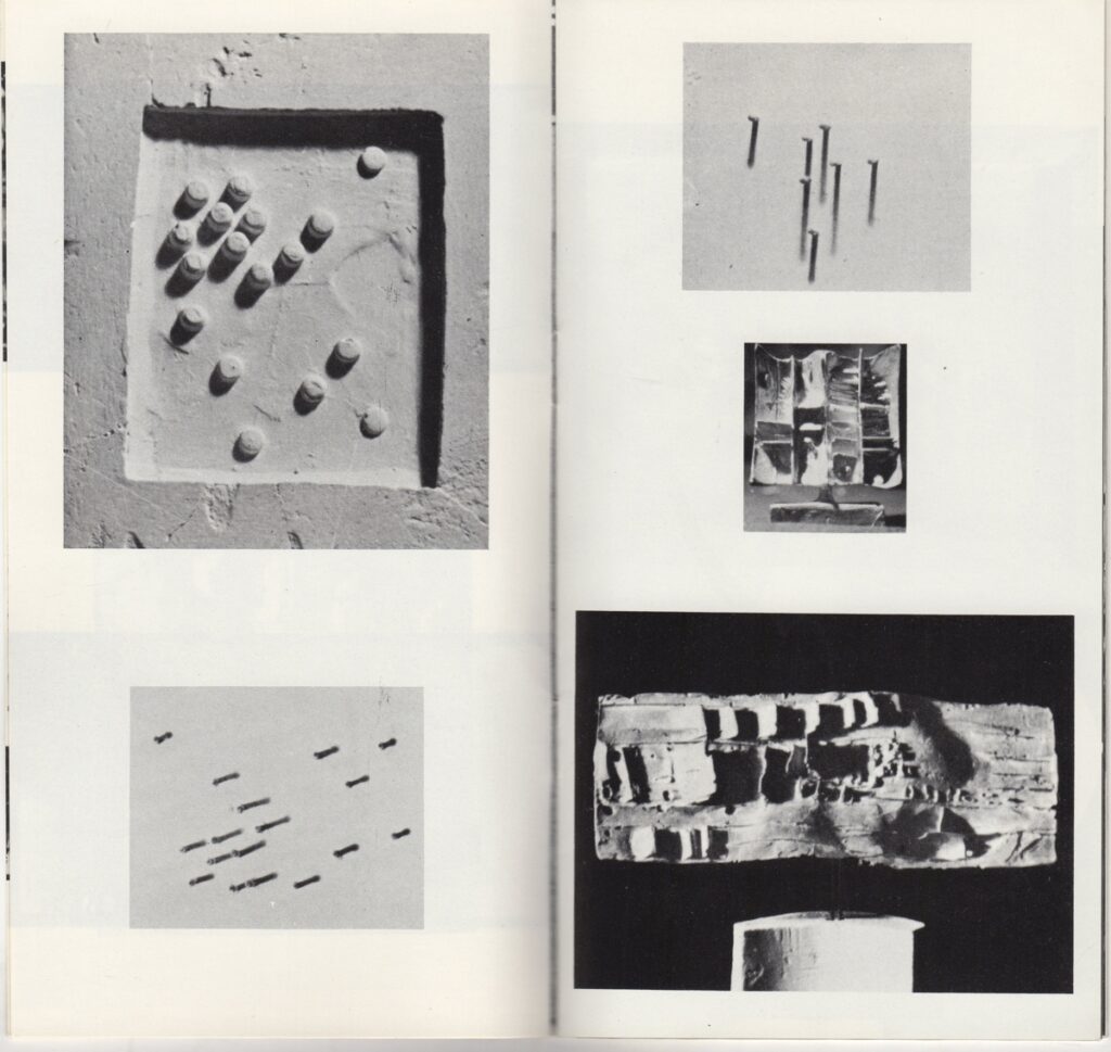 Κατάλογος, χαρτί ιλλουστρασιόν, 14 φφ, 20×10,5 εκ., στα ελληνικά, έκθεσης του Κοσμά Ξενάκη. Περιέχει κείμενο του καλλιτέχνη για το έργο του και εικονογράφηση.