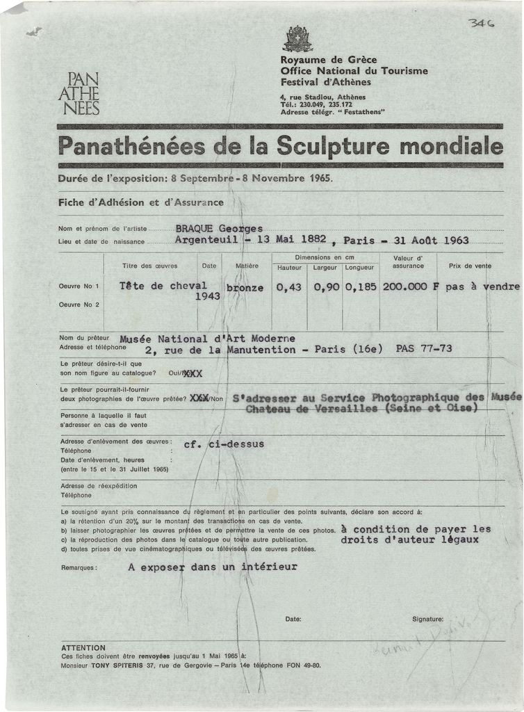 Αντίγραφο δελτίου συμμετοχής και ασφάλισης έργων τα οποία παρουσιάζονται στα ‘Παναθήναια της Παγκόσμιας Γλυπτικής’ στην Αθήνα, χαρτί, 29×21 εκ., στα γαλλικά. Στο παρόν αναγράφεται έργο του Georges Braque, το οποίο προέρχεται από τη συλλογή του Musée National d’ Art Moderne του Παρισιού.