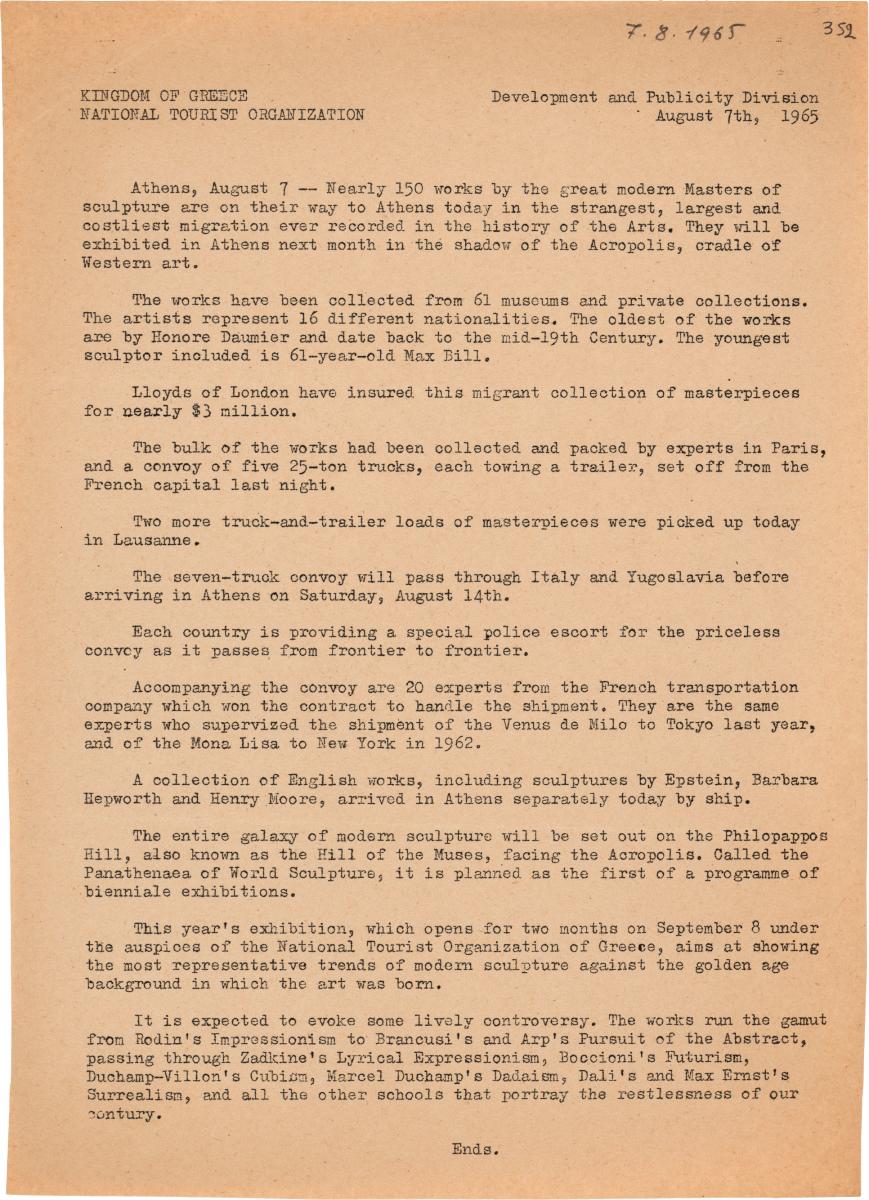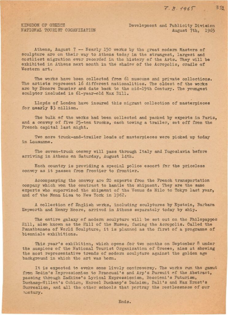 Δελτίο τύπου της 1ης Παγκόσμιας Έκθεσης “Παναθήναια της Συγχρόνου Γλυπτικής” που διοργανώθηκε στην Αθήνα. Δίνονται πληροφορίες για τη διοργάνωση και κυρίως για τη μεταφορά και το στήσιμο των έργων.