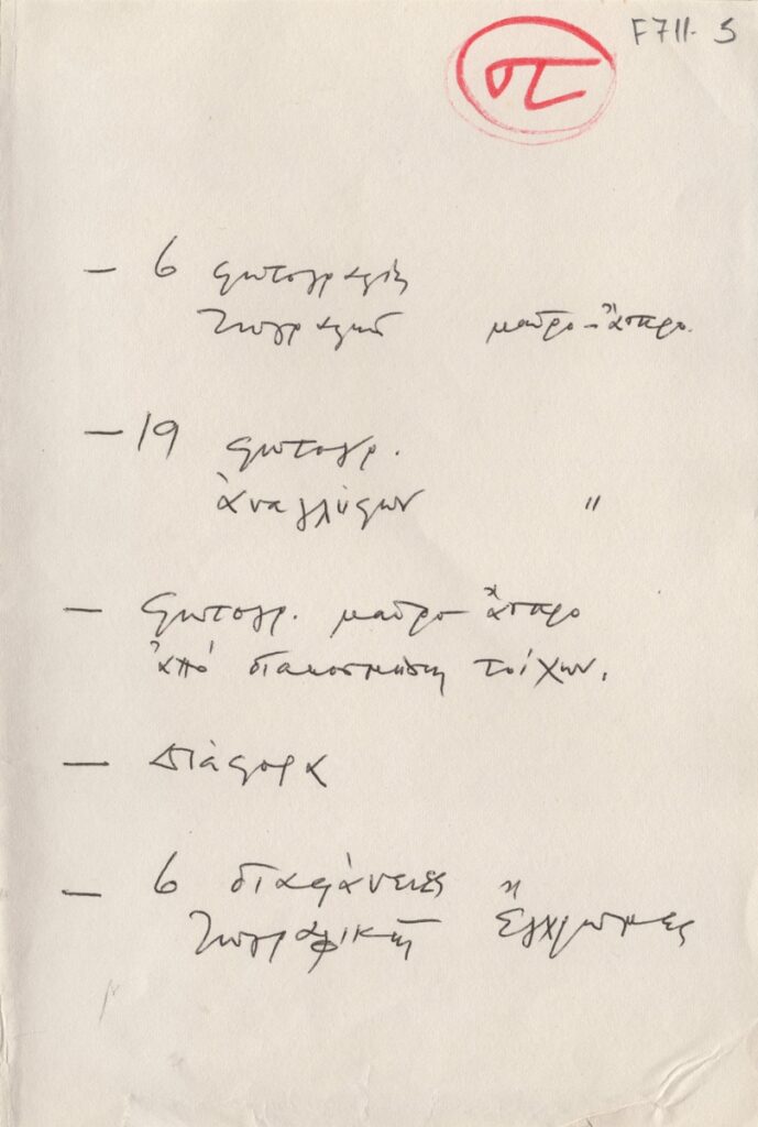 Σημειώσεις, χειρόγραφο με μαύρο μελάνι, στα ελληνικά, χαρτί, 29×21,5 εκ., με αναγραφόμενες πληροφορίες για φωτογραφίες και διαφάνειες έργων του Κοσμά Ξενάκη.