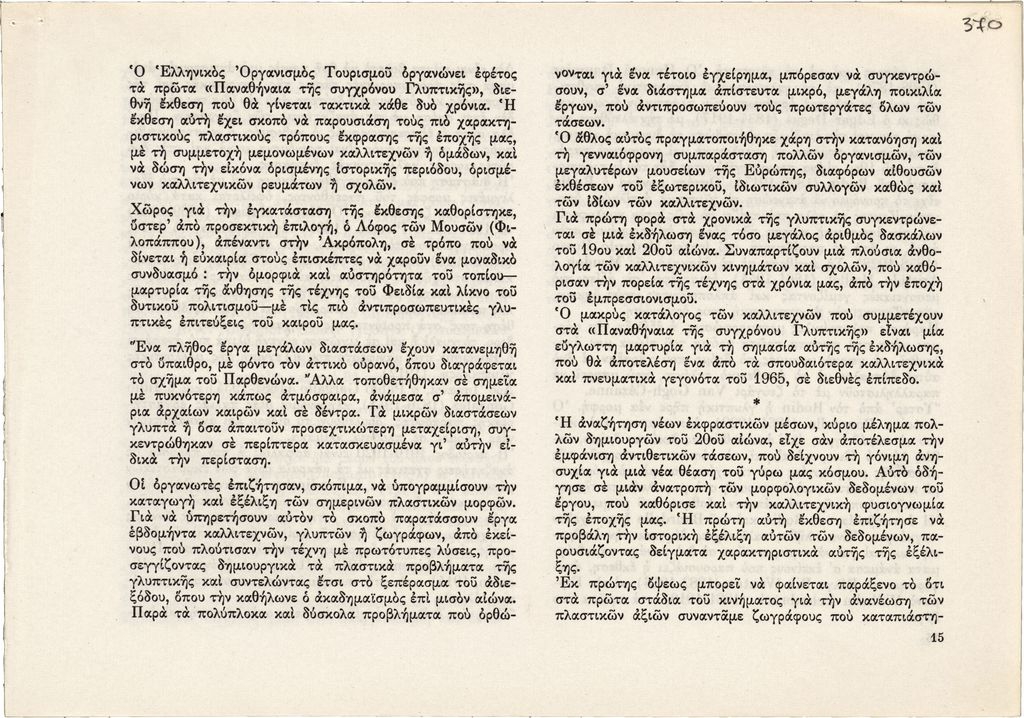 Τμήμα καταλόγου της “1ης Διεθνούς Έκθεσης Γλυπτικής” (‘Παναθήναια της Παγκόσμιας Γλυπτικής’) της Αθήνας, χαρτί, 6 φφ, 17×24 εκ., στα ελληνικά.