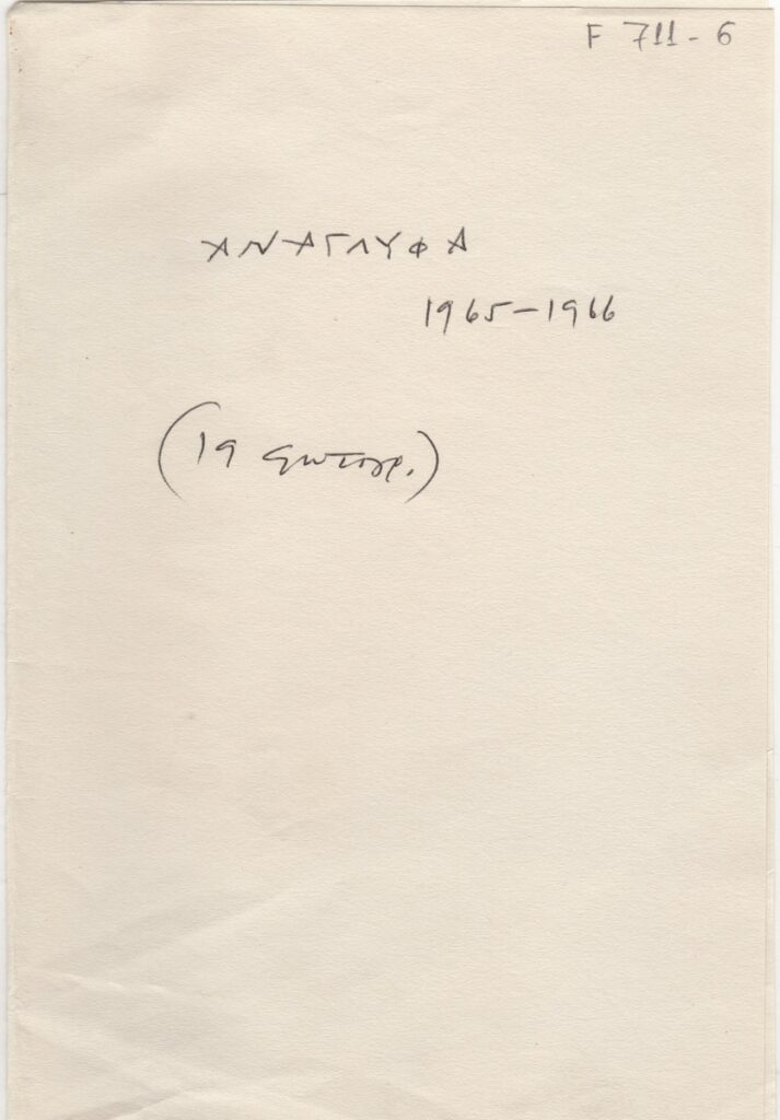 Σημειώσεις, χειρόγραφο με μαύρο μελάνι, χαρτί, 4 φφ, 29×21,5 εκ., στα ελληνικά, με αναγραφομένες λεπτομέρειες για την καλλιτεχνική δραστηριότητα του Κοσμά Ξενάκη και με αναφορά σε φωτογραφίες έργων του.