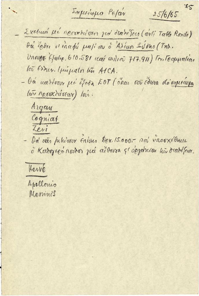 Φωτοαντίγραφο χειρόγραφης σημείωσης (ή προσχεδίου επιστολής), χαρτί, 21.5×14.5 εκ., στα ελληνικά, του Τώνη Σπητέρη, προς τη Μαρία Ρεζάν, στο οποίο αναγράφει τα ζητήματα που θέλει να της επισημάνει αναφορικά με τη διοργάνωση των Παναθηναίων της Παγκόσμιας Γλυπτικής στην Αθήνα. Ειδικότερα αναφέρεται σε προσκλήσεις που πρέπει να σταλούν σε καλλιτέχνες, ιστορικούς και κριτικούς της Τέχνης.