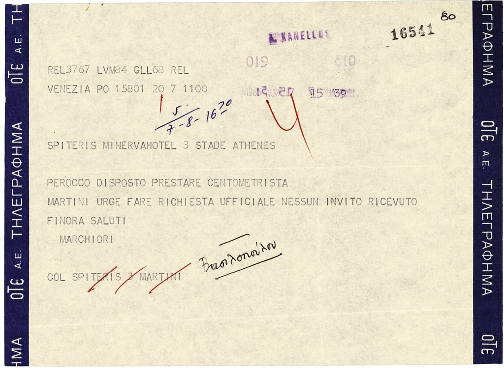 Τηλεγράφημα του Giuseppe Marchiori προς τον Τώνη Σπητέρη