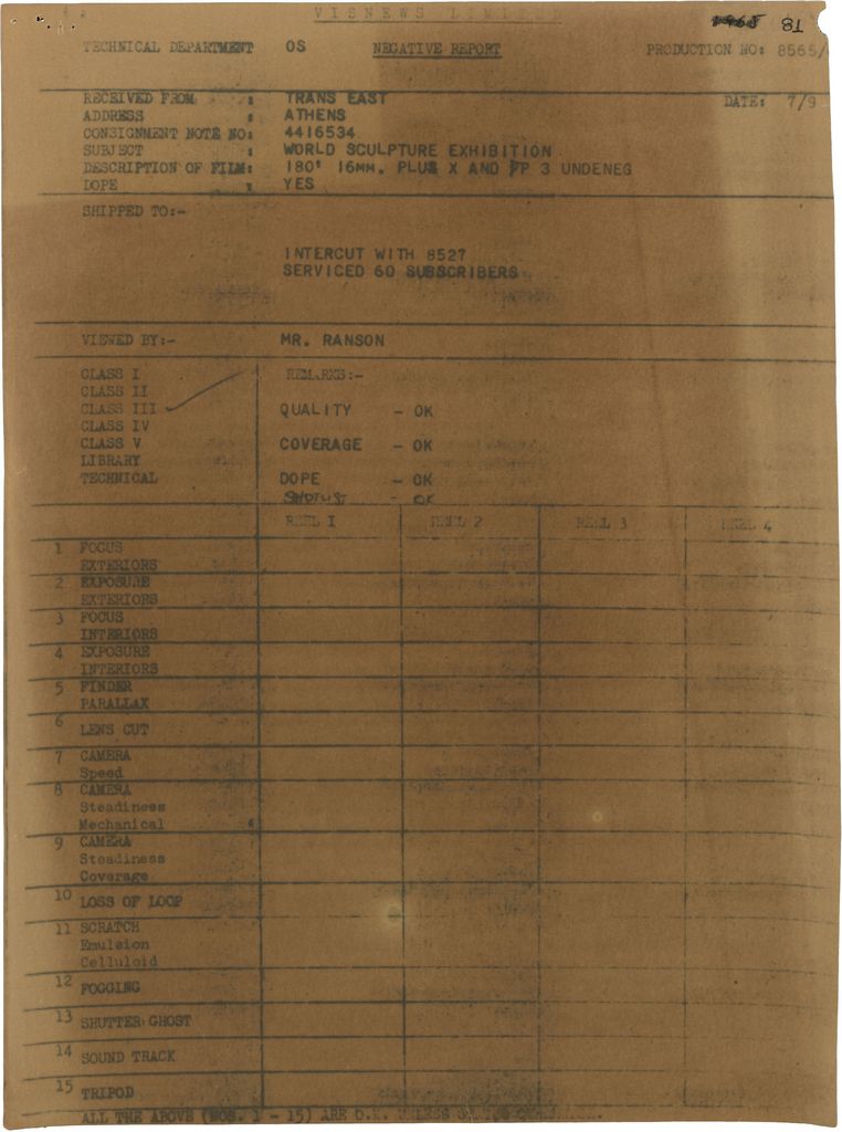 Πρόκειται για έντυπο της εταιρείας “Visnews” με θέμα τη δημιουργία φιλμ για τα Παναθήναια της Παγκόσμιας Γλυπτικής.