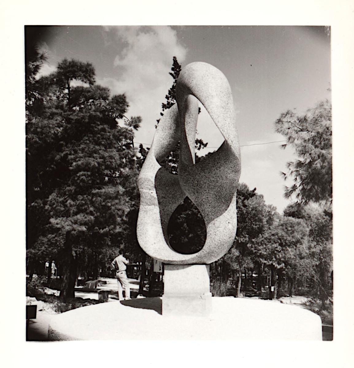 Ασπρόμαυρη εκτυπωμένη φωτογραφία έργου του Max Bill, το οποίο παρουσιάστηκε στην 1η Παγκόσμια Έκθεση “Παναθήναια της Συγχρόνου Γλυπτικής” στην Αθήνα.