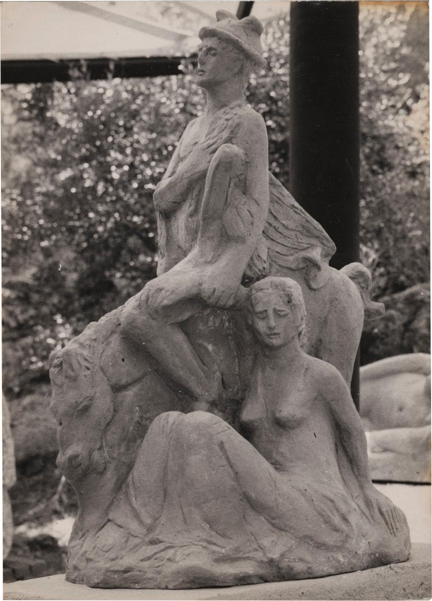 Ασπρόμαυρη εκτυπωμένη φωτογραφία έργου του Γιαννούλη Χαλεπά, το οποίο παρουσιάστηκε στα ‘Παναθήναια της Παγκόσμιας Γλυπτικής’ στην Αθήνα. Στην πίσω όψη, σφραγίδα φωτογράφου.