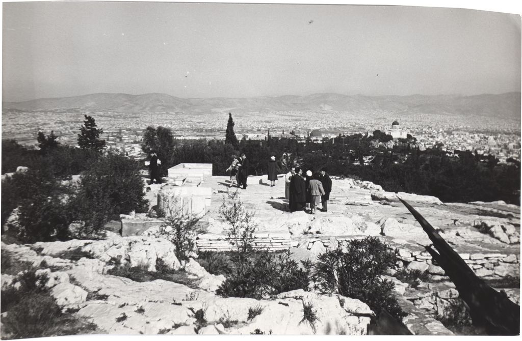Φωτογραφία, α/μ, φωτογραφικό χαρτί, 11,5×18,5 εκ., τμήματος αρχαιολογικού χώρου, με θέα την Αθήνα. Στο βάθος πρόσωπα που περιηγούνται εκεί.