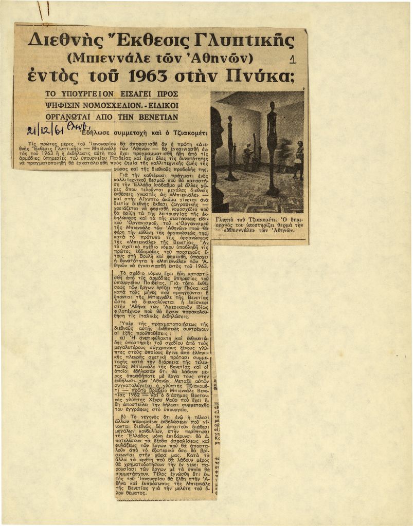 Απόκομμα, χαρτί κολλημένο σε λευκή κόλλα, 27×21 εκ., στα ελληνικά, δημοσίευσης άρθρου το οποίο ασχολείται με την διοργάνωση της Μπιεννάλε Γλυπτικής (Παναθήναια) στην Αθήνα, τις ημερομηνίες εγκαινίων, την υλοποίηση του θεσμού και τους όρους της.