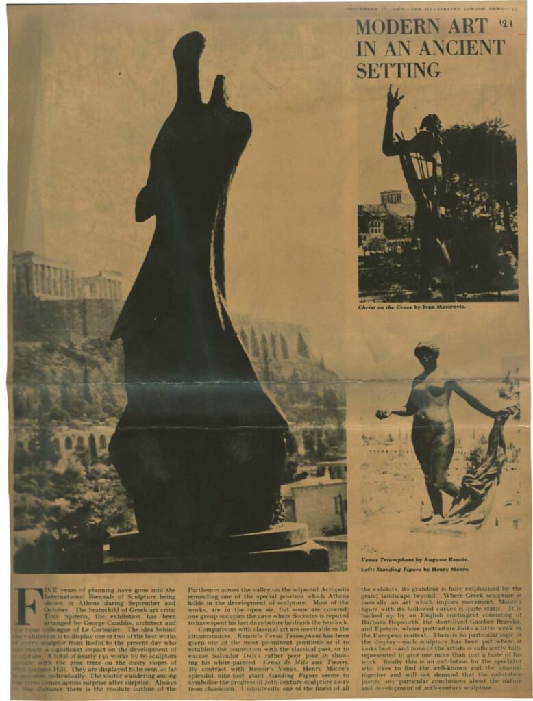 Φωτοαντίγραφο αποκόμματος της εφημερίδας “The Illustrated London News” (18/09/1965), όπου δημοσιεύεται άρθρο με θέμα τα “Παναθήναια της Παγκόσμιας Γλυπτικής” της Αθήνας. Δίνονται πληροφορίες για τη διοργάνωση της έκθεσης ενώ αναφέρονται έργα που παρουσιάζονται σε αυτήν.