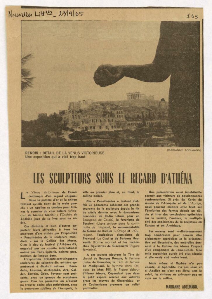 Απόκομμα της εφημερίδας “Nouvelles Littéraires” (23/09/1965) όπου δημοσιεύεται άρθρο με θέμα τα “Παναθήναια της Παγκόσμιας Γλυπτικής” της Αθήνας. Γίνεται λόγος για τα έργα που παρουσιάζονται και σχολιάζεται η διοργάνωση.
